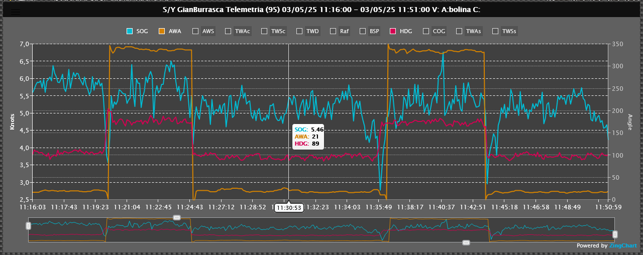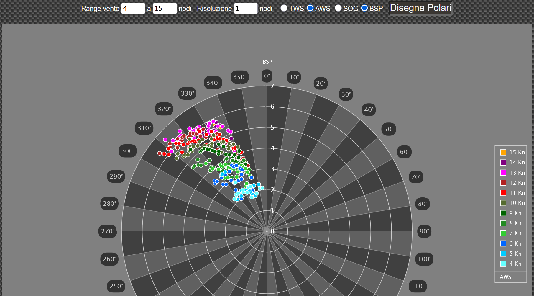Dall’analisi della telemetria, selezionando gli opportuni bordi è possibile elaborare il diagramma polare reale della propria imbarcazione con le specifiche condizioni di navigazione